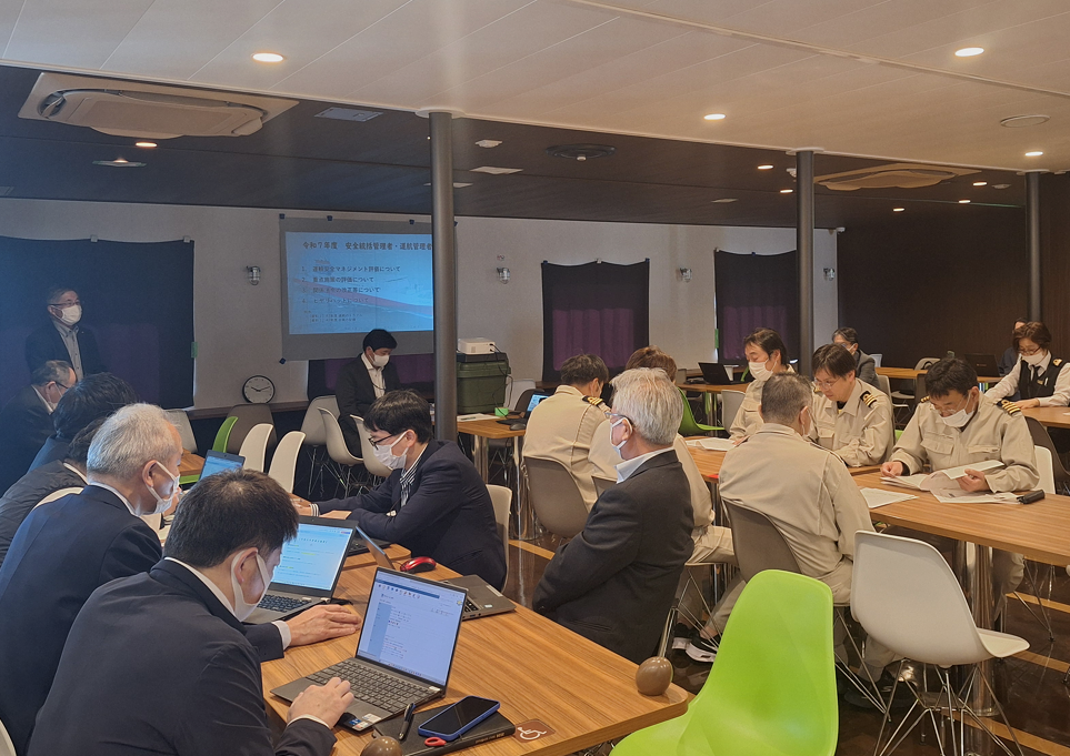 TOP お知らせ一覧 令和7年度 安全統括管理者・運航管理者会議(マネジメントレビュー)の開催について 令和8年3月3,4日 宮崎港停泊中の「フェリーたかちほ」「フェリーろっこう」にて経営トップ参加による令和7年度の安全管理体制に係る「マネジメントレビュー」を実施しました。 お知らせ一覧へ戻る