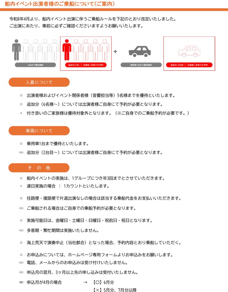令和8年度お申込み分より、出演に伴うご乗船ルールを改定いたしました。ご確認いただけますようお願いいたします。
