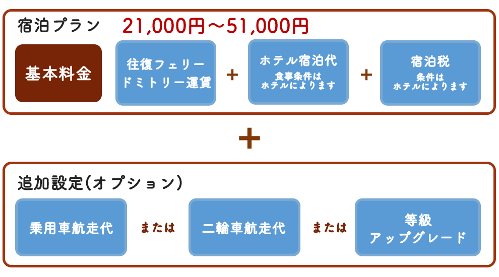 費用に含まれるもの宿泊プラン:往復フェリードミトリー運賃・ホテル宿泊代